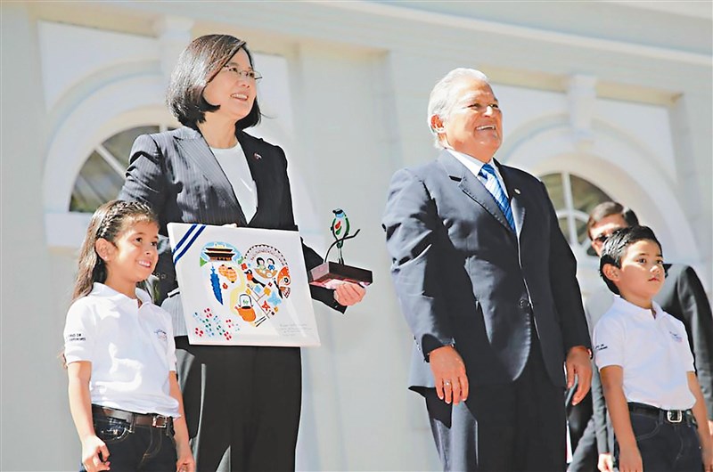 薩爾瓦多昨宣布與台灣斷交,與北京建交。圖為蔡總統去年訪問薩爾瓦多,和桑契斯總統(右)接受孩童呈獻當地傳統手工紀念品情景。圖/資料照片