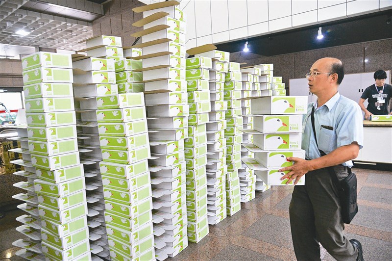 ➡國民黨昨將三項公投案連署書,以卡車載運至中選會遞交,中選會準備大批紙箱裝運。圖╱中央社
