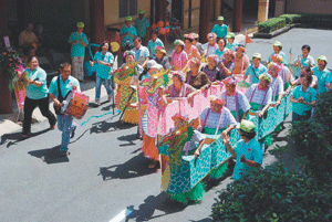 每位參賽的阿公阿嬤,都穿上可愛的夏威夷草裙,頭上則戴花環,腳上穿的更代表著同心協力的木屐,划的槳也是阿公阿嬤平時用來當支柱的輔助杖,就在路上划起龍船來,發揮象徵同舟共濟的精神,個個看起來就像是老頑童一般可愛逗趣。