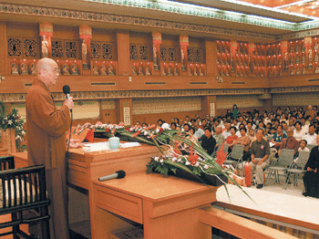 慈容法師勉勵大眾,要以正見、正思惟、正語、正業、正命、正精進、正定「八正道」生活,再修十善法;遇到挫折時,則以四念處觀身不淨、觀受是苦、觀心無常、觀法無我的智慧對治。