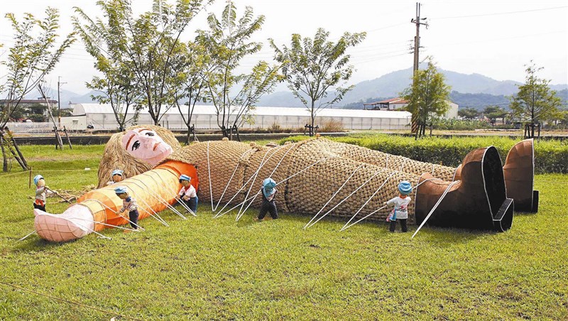 【本報高雄訊】美濃區公所主辦的「美濃秋冬樂活嘉年華」昨起在美濃湖畔登場,以稻草等在地農庄田園元素,打造稻草童話世界,彷彿一場童話穿越劇,與一旁湖光山色相互輝映,適逢假日吸引大批民眾造訪。