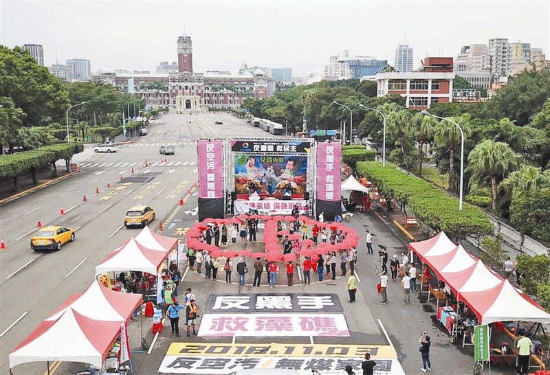 反空汙救藻礁大遊行昨天在總統府前登場,環保團體在凱道上用雨傘排出圈選票章的圖樣,意寓民眾用選票來表達對政策跳票的不滿。圖/台灣健康空氣行動聯盟提供
