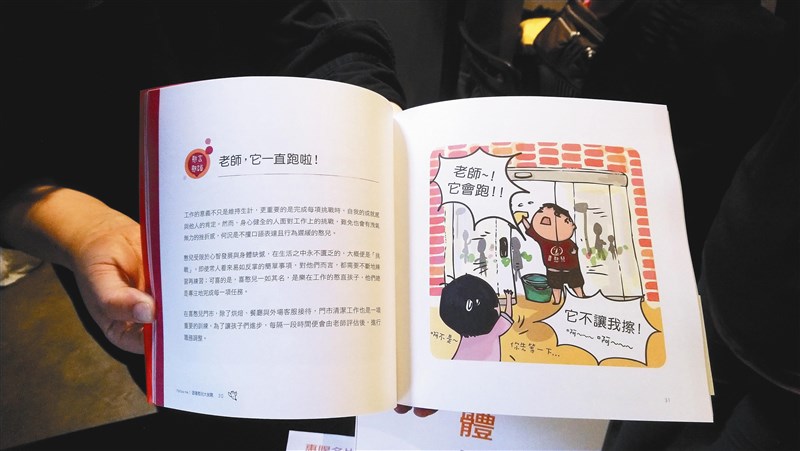 繪本中一個故事是描述憨兒擦窗戶,沒想到一靠自動門就往兩旁「躲」,不得不向老師求助。圖/記者李祖翔