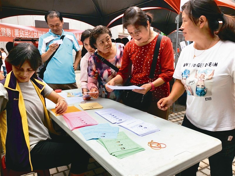 南投縣選委會昨天舉辦模擬投票,參與的民眾相當踴躍,也特別教導老人家利用顏色辨識不同的選舉票。圖╱江良誠