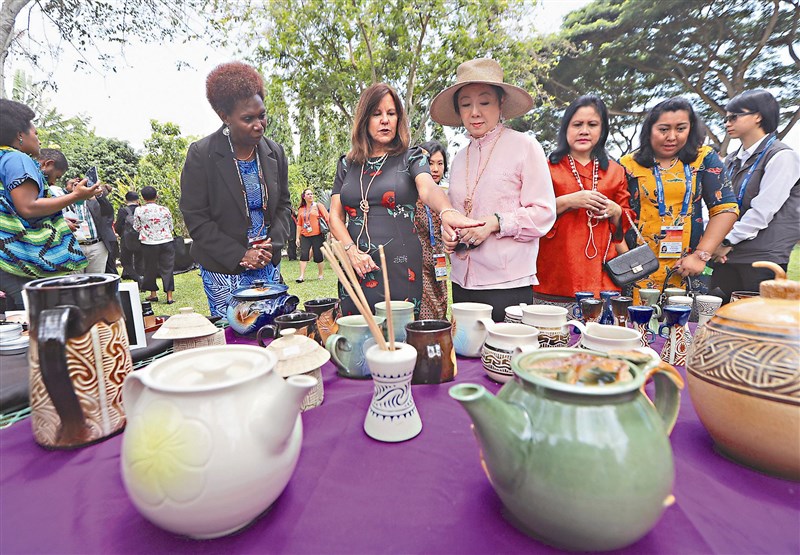 張忠謀夫人張淑芬(左三)十八日與各國領袖夫人,以及美國副總統夫人凱倫潘斯(左二)一同逛攤位。圖/中央社