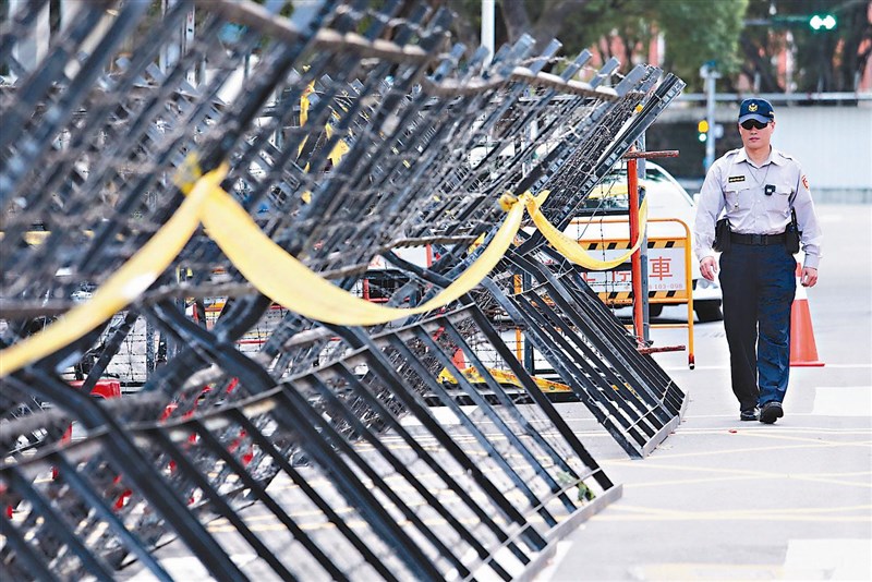 九合一併公投選舉落幕,開票時發生有投票所仍在投票等亂象,中選會遭外界強烈質疑。警方昨天在中選會外架上層層拒馬,並派員戒備,防止有人不滿前往抗議。圖/胡經周