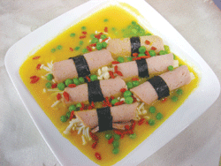 1.將金針菇排齊燙熟取出,素火腿片平置於盤上,燒海苔切條狀,放入金針菇並捲起,用紫菜條固定,再蒸一分鐘取出。