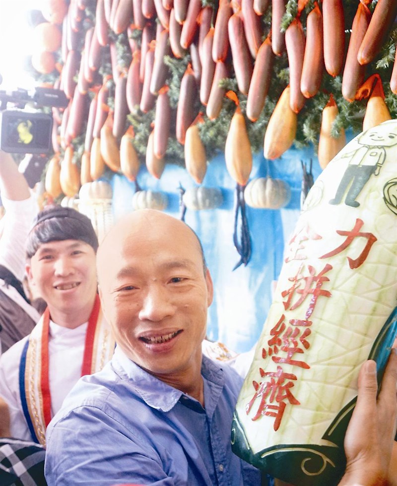 【本報高雄訊】高雄市長當選人韓國瑜選前造勢時誤將「白玉蘿蔔」說成「白玉苦瓜」,意外讓白玉苦瓜身價翻漲,韓國瑜昨天出席高雄杉林區瓜瓜節,現場人氣爆棚,還有熱情農友獻上白玉苦瓜。韓國瑜重申,一定會幫大家搶訂單,台下掌聲如雷。