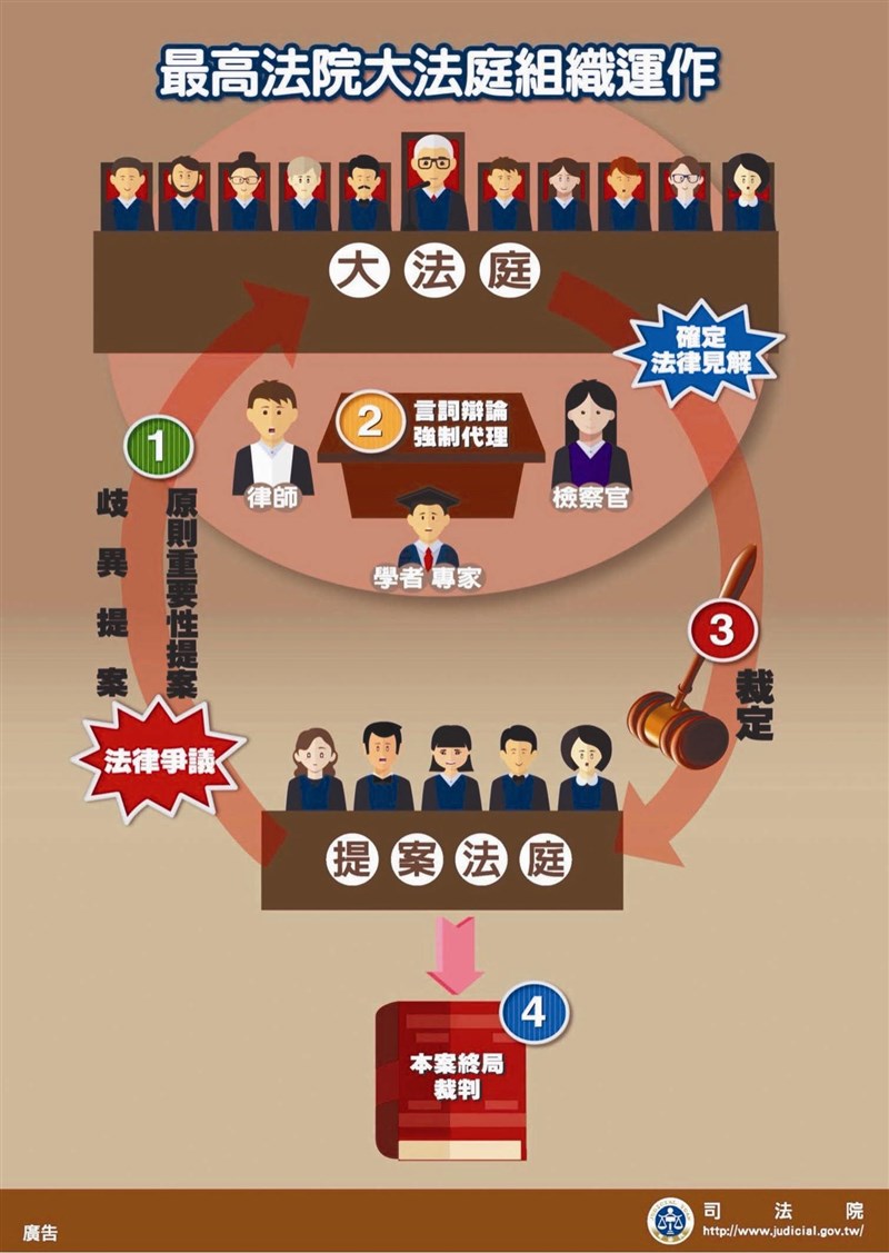 將來若法庭見解出現歧異,可由最高法院、最高行政法院法官組成「大法庭」解作統一裁定。圖/司法院提供