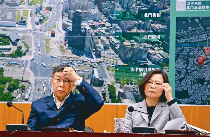 蔡英文總統(右)與台北市長柯文哲(左)在北門舉行「蔡柯會」,隨後到北門中華郵政大樓聽取簡報,不過兩人面色都很凝重。圖/陳柏亨
