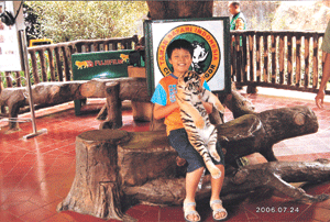 那天,媽媽帶我們去動物園,我看到有人在跟小老虎合照,我也要求媽媽讓我和小老虎合拍,媽媽答應了,我坐到椅子上,工作人員把一隻小老虎抱給我,沒想到,我一抱起牠,自己卻冷汗直流,一個不留神,小老虎從我的手中滑了下去,馬上跑走。