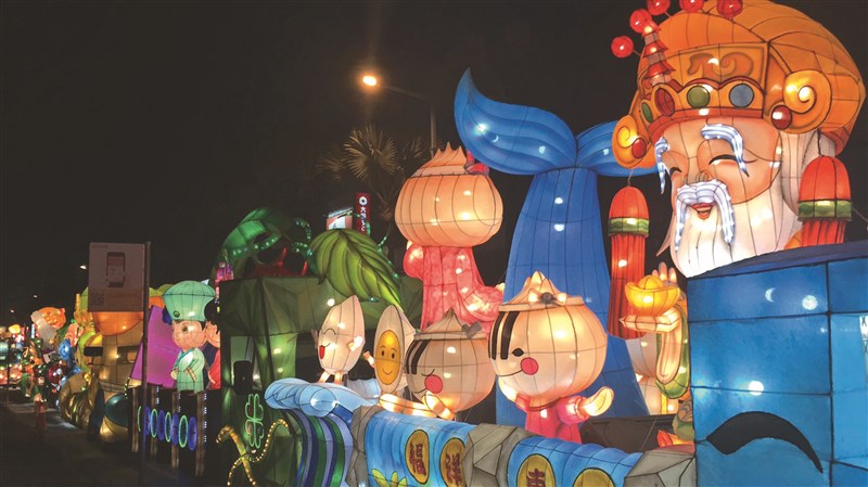 二○一九台灣燈會三十周年,將於明年二月十九日至三月三日首次在屏東舉行,三十三鄉鎮市以地方農漁牧、文化風情為設計概念,打造在地特色花燈車日前點燈,同時在屏東市遊行亮相,為燈會暖身,沿路吸引人潮觀賞及拍照。圖/中央社