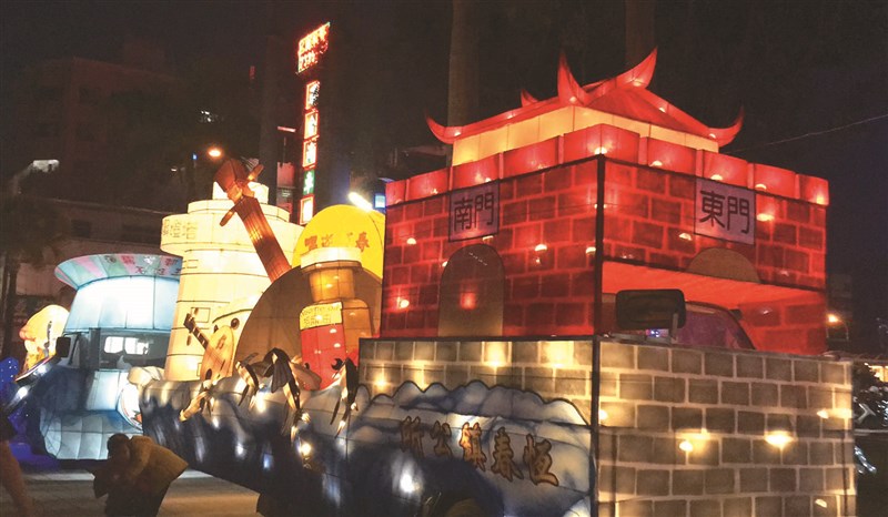 二○一九台灣燈會為首次在屏東舉行,屏東縣府邀請各鄉鎮市製作特色花燈車,接力點燈,將在台灣燈會中展示。圖為恆春鎮以古城門和月琴為意象打造的花燈車。圖/中央社