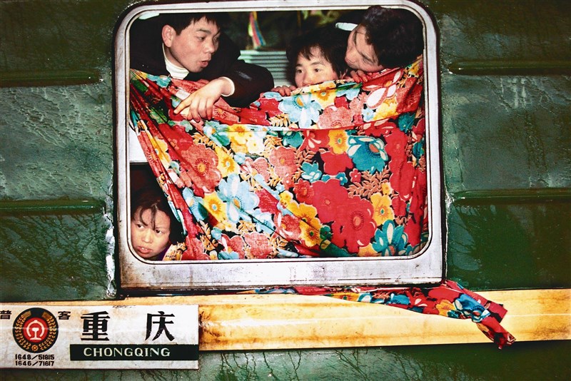 大陸「改革開放」四十年來,從一億人次到近三十億人次,春運規模擴大了三十倍。圖為早年開往重慶的列車,旅客從窗口的擋風被單向外張望。圖/新華社