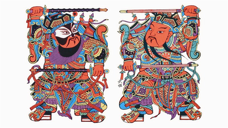 年畫最古老題材記載於《風俗通義》,神荼、鬱壘兄弟二人居住在東海度朔山上,在桃樹下檢閱百鬼,並捉害人的惡鬼。後來人們將二人畫在桃木板,懸掛在門上,祈求兄弟二人持續為人們趨吉辟邪、看守門戶,保佑家宅平安,這也是中國最早的門神由來。