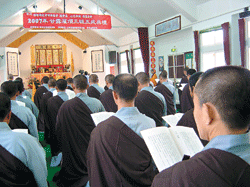 【人間社記者平曜台南報導】台南監獄明德戒治分監五十九位收容人,六日求受三皈五戒,恭請國際佛光會中華總會總會長心定和尚主持,台南監獄典獄長蕭明毅期許同學,一般監所再犯率約百分之六、七十,而明德戒治分監約百分之三十六,比例相當低,這是很難能可貴的。