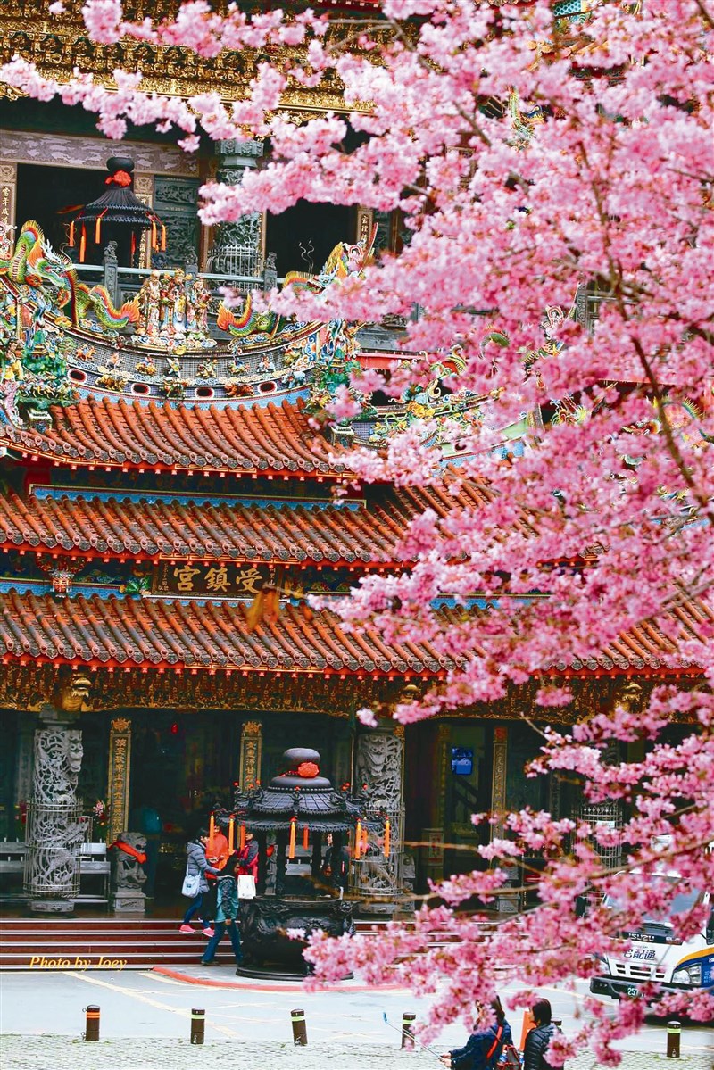 阿里山花季下月九日登場,首次推出櫻花圖案的入園紀念票券供收藏。圖為阿里山受鎮宮前綻放九成的阿龜櫻。圖/中央社