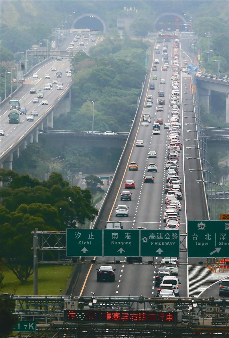昨日二二八連假首日,上午六時起國道北部多處南下路段開始湧現車流,圖為國3新店至木柵(右),通往國道5號車速僅十到二十多公里。圖/胡經周