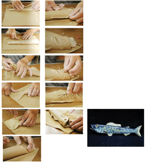 1~5 利用刀鞘式做法,將報紙折成二個一大一小的三角椎,並交互套住,接著用泥土把模形包裹住,接縫處打薄,用泥漿黏接起來,且黏接面朝下。之後,在尖端捏出魚尾,並愈打愈薄,讓尾巴翹起來。另一端則先抽出一個三角椎報紙。