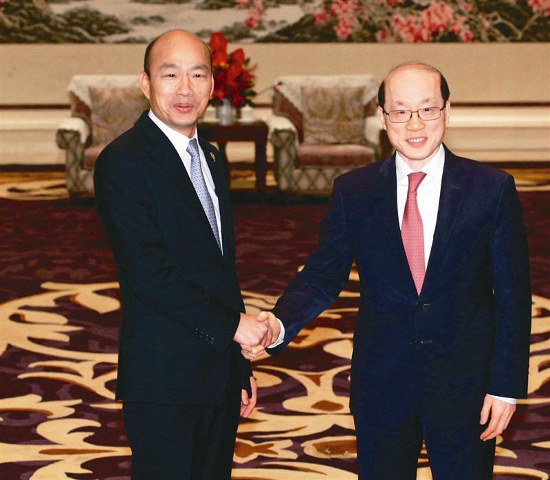 高雄市長韓國瑜(左)與中國大陸國台辦主任劉結一(右),昨天在深圳麒麟苑九洲廳會面。圖/劉學聖