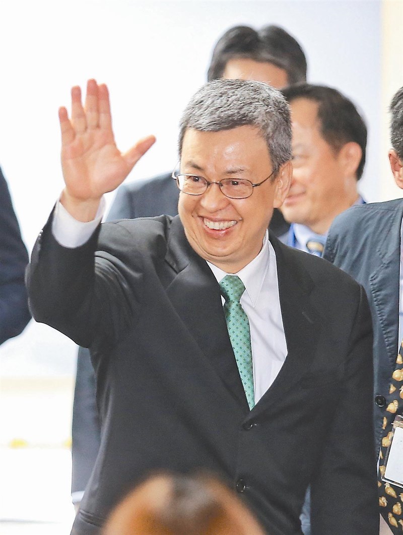 副總統陳建仁昨天用臉書公開發文表態不連任,他出席中央通訊社社慶,離去前向眾人揮手致意,並呼籲民進黨黨內團結支持蔡英文總統。圖/鄭清元