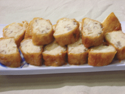 馬蹄四兩。豆包漿、素鱈魚漿各八兩。袖珍菇一斤、半圓豆皮三張。低筋麵粉、玉米粉、太白粉適量。