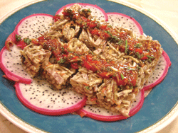 芋頭三○○克。金針茸、筍絲各五兩。香菇絲二兩、海苔二片、千張一張。豆皮、低筋麵粉、熟白芝麻少許、薑適量。