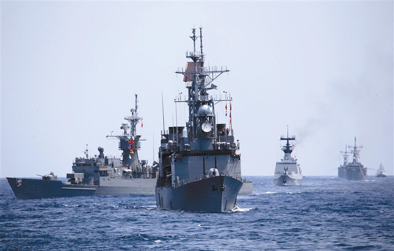 國防部昨天在東部海域執行戰備訓練,出動宜陽艦(左起)、基隆艦與昆明艦等二十二艘水面艦,是近年最大海上操演。