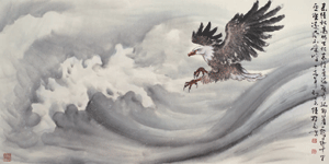 大鵬鳥的志向是遠大的,大鵬鳥的天地 ---北海與南海是無限壯闊的。而且大鵬鳥翱翔在天地之間,展現出無比的自由自在,加上鷹在天空中展翼的美妙體態,以及雄壯威武的凌風氣勢,這些都是畫鷹時可以發揮著墨的地方。