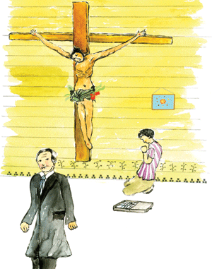 「年輕人,記得一件事:不管信徒祈求什麼,你都只是聽聽就好,千萬不能說話喔!」耶穌千叮萬囑的提醒年輕人。