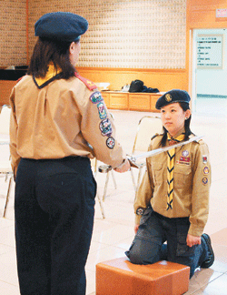 隨後,晉升團員接受晉級儀式。圖為Scouter Dinah手執長劍輕放至晉升團員肩上,團員在配戴羅浮肩章後,正式成為一位樂行童軍。