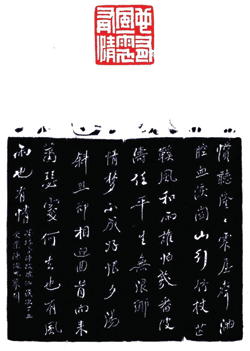 行書邊款。釋文:「慣聽隆隆震屋聲。滿腔血淚關山行。竹杖芒←風和雨。誰怕。幾番波濤任平生。無限鄉情夢不成。好恨。夕陽斜照卻相迎。回首向來蕭瑟處。何去。也有風雨也有情。」墨緣吾師改波仙(詞)。歲次丁丑。受業陳俊光摹刻