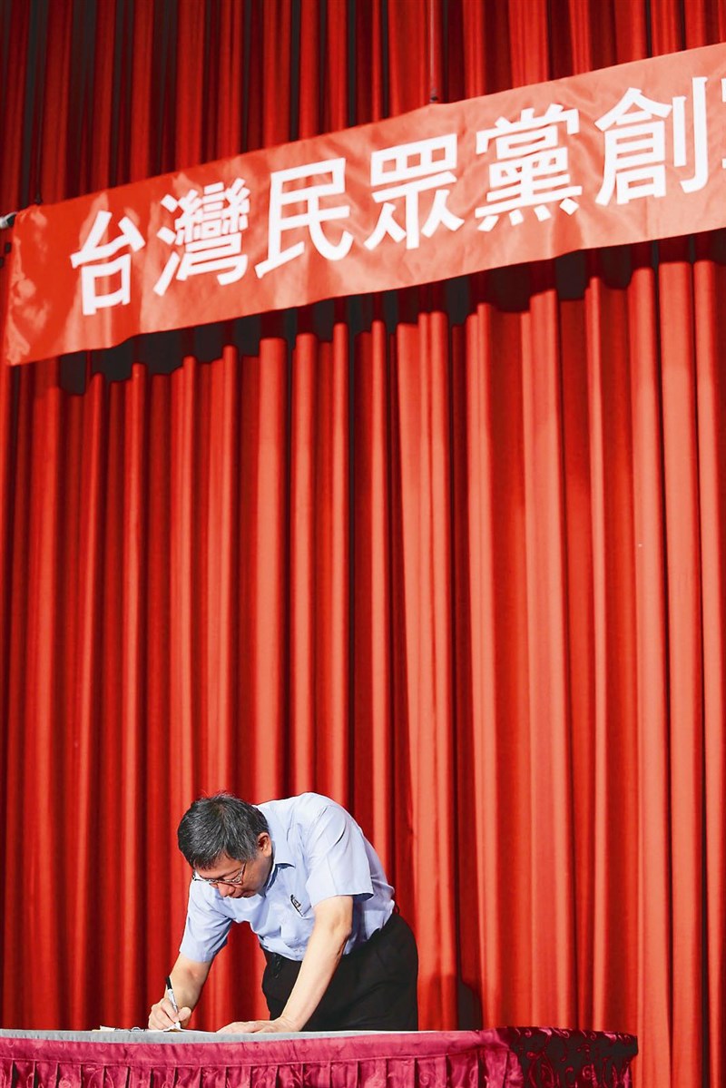 台灣民眾黨創黨大會昨日在台大醫院國際會議中心舉行,身兼黨主席的台北市長柯文哲發表短講後,簽署創黨首份公文。圖/中央社