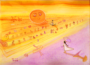 洋,用暗喻法「黃昏的海面 是太陽的日記本」作詩的開頭,