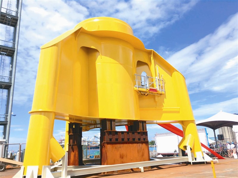 【本報高雄訊】中鋼集團旗下興達海洋基礎公司昨天與丹麥離岸風電開發商沃旭能源在高雄港74號碼頭,為第一座台灣製水下基礎轉接段(Transition Piece,以下簡稱:TP)舉行試製完工典禮。未來希望台灣能成為全世界水下基礎供應鏈重要一環。