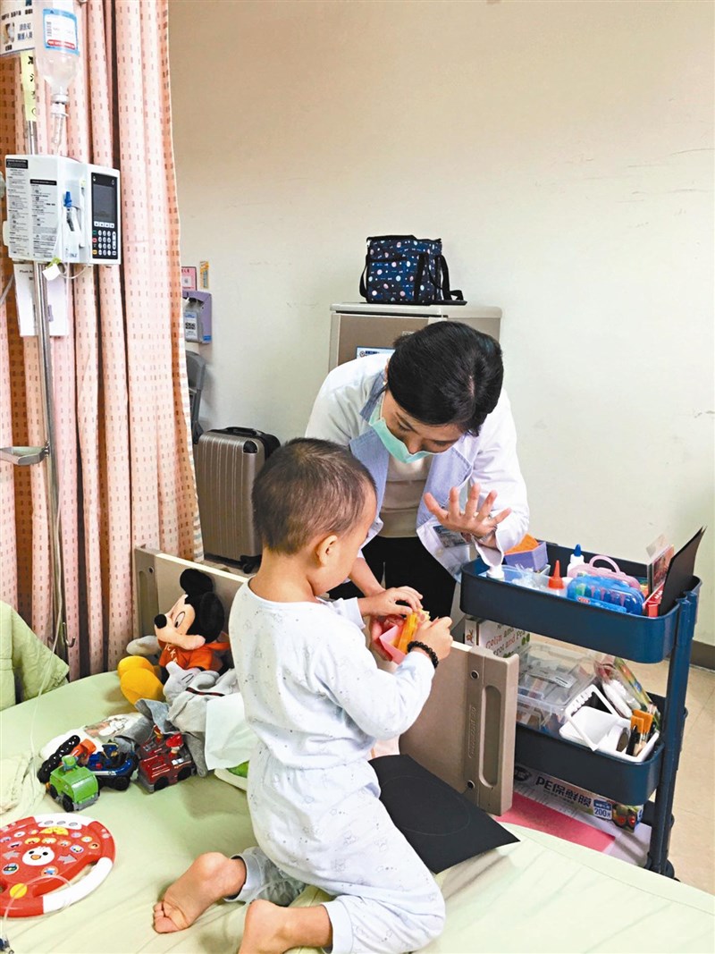 【本報高雄訊】高醫附院小兒科的血液腫瘤病房,近日推出「藝術治療開箱文」,藝術治療師王莉鈞說,開箱文內容其實就是藝術治療的「行動百寶箱」,每周一次推著推車到各病房間穿梭,進行藝術治療,載滿著讓每雙小眼睛為之一亮的創作媒材,讓原本只有針筒、藥物、消毒水的冰冷病房,變成歡樂遊戲場。
