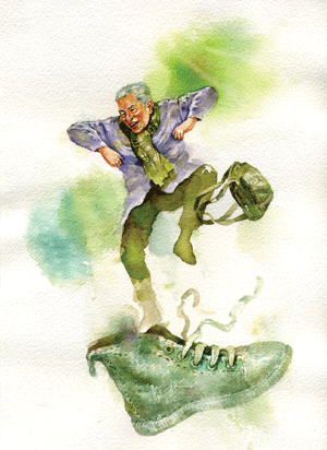 電視上有一位老先生「全副武裝」要騎自行車環台;陣容龐大,浩浩蕩蕩。老爺爺看了十分心動,悄悄買了一輛舊自行車,對兒、媳謊稱是去市場買菜,其實是先計畫環繞住的大城市周邊,再到郊外去欣賞田野風光。
