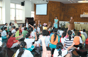 監寺覺興法師以「一顆寶石」故事,啟發學童認識自己內心也有一顆彌足珍貴的寶石,要如何顯露出自我內心寶石光芒?唯有心存好心、口說好話、身做好事。隨後以有獎徵答來鼓勵學童,只見學童踴躍舉手搶答。