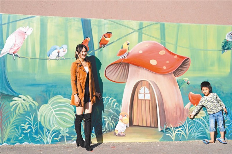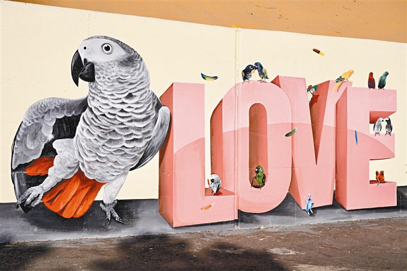 牧田創意彩繪工作室負責人彩繪師陳詩薏說,各地雖有不同彩繪牆,但大多以狗貓或海洋生物為主題創作,六腳堤岸鸚鵡是彩繪主角,她在網路徵選鳥友鸚鵡照片,作為彩繪的主題。
