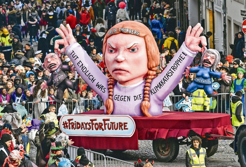 鼓吹周五罷課的瑞典氣候少女童貝里,已成為新世代參與氣候變遷辯論的重要象徵,稱為「童貝里世代」。圖為德國杜塞多夫的嘉年華,出現以童貝里為造型的花車。圖╱美聯社