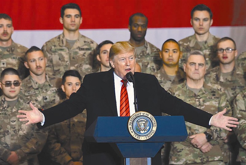 美國總統川普二十八日突然造訪阿富汗的美軍基地,對官兵發表談話,並宣布與塔利班重啟和平談判。圖/法新社