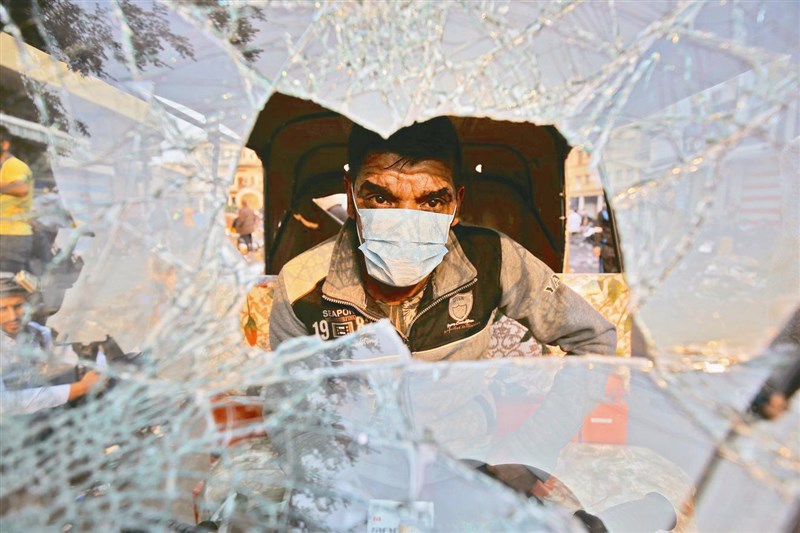伊拉克示威暴亂持續逾月,總理馬帝周五宣布將向國會請辭,圖為巴格達一輛嘟嘟車擋風玻璃在警民衝突中被打破,司機一臉無奈。圖/法新社