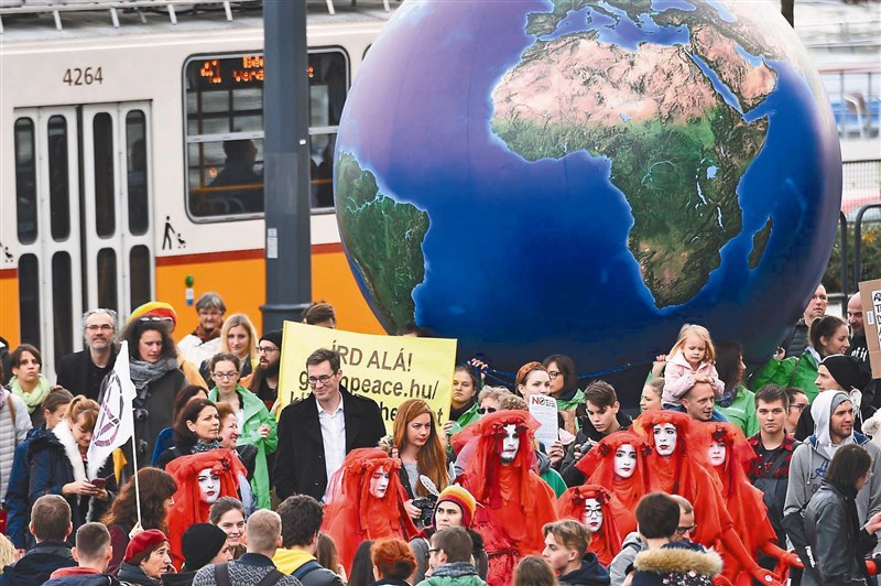 群眾上月二十九日在匈牙利首都布達佩斯遊行,提醒世人注意氣候變遷。圖/法新社
