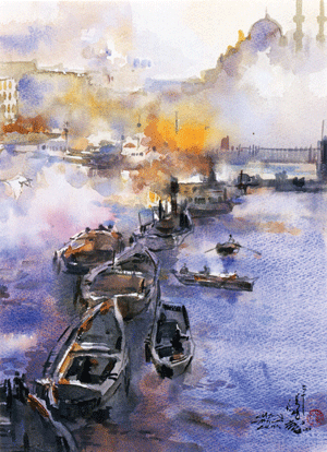 他點了一杯二百五十元的咖啡,靜靜坐在三樓陽台上,看著海上的落日與淡淡的逝水,不喝,讓那咖啡香一縷一縷香味飄過鼻端,直到星座映入咖啡裡。