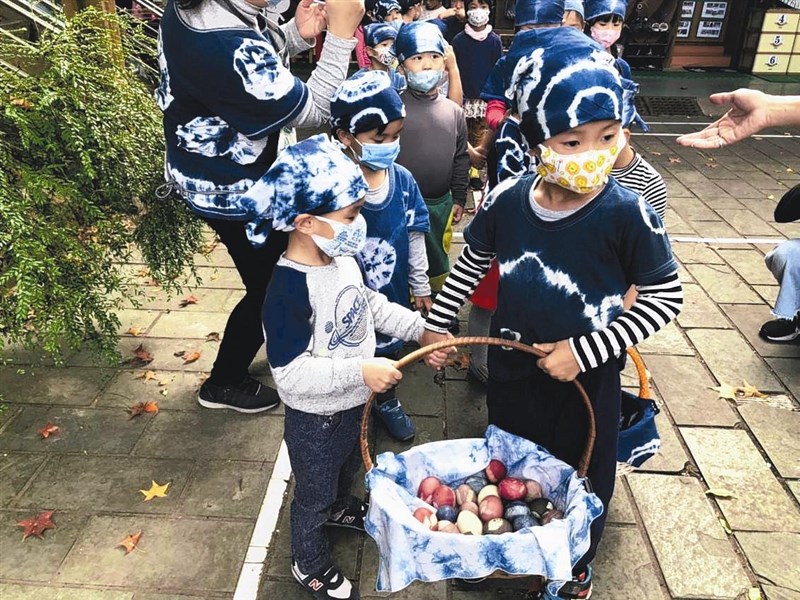 插角國小附幼校長陳宥然表示,幼兒園創意十足的老師與社區老街僅存的「簡單生活藍染工作室」合作,將在地染布的特色融入歲末年終體驗「施比受更有福」課程,陪孩童一起討論染蛋顏色後,利用校園中的春不老、七里香、蝶豆花等植物,製作出「藍染彩蛋」,分享給學校師長、社區長輩們,讓今年冬天更溫馨。