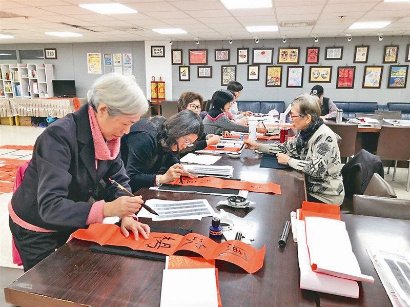 早期女性很少寫春聯,金門宗祠內的春聯更不能由女性來寫,如今女性地位提升,金門縣樂齡學習中心舉辦「我家春聯我來寫」活動(圖╱蔡家蓁),邀請書法家來教長者寫春聯。