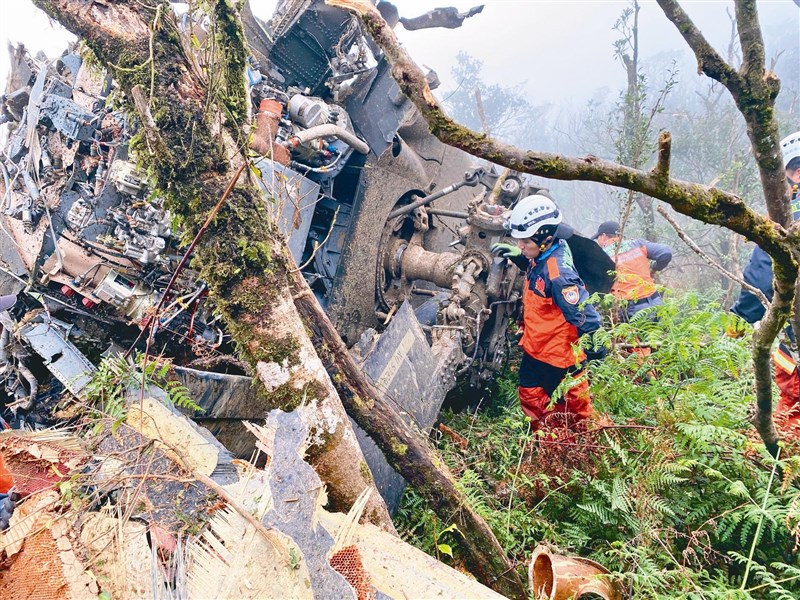 一架黑鷹直升機昨迫降新北市烏來山區,機身面目全非。圖/中央社