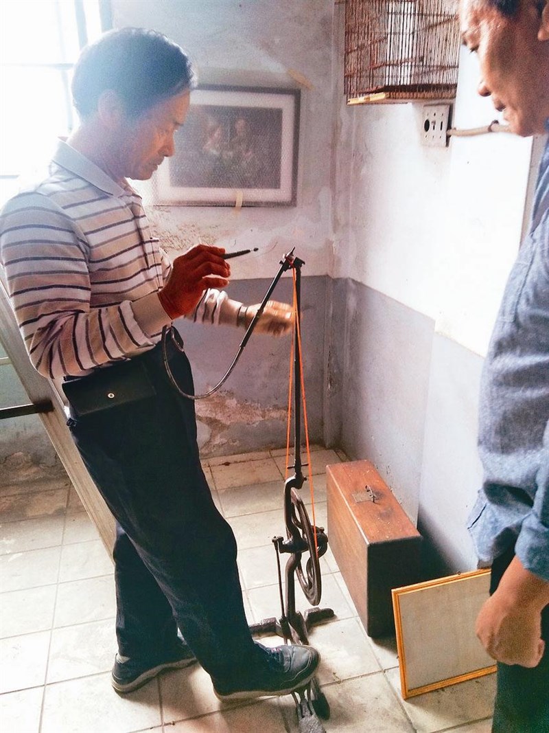 邱姓師傅店中還保留市面上已很難見的腳踩式磨牙、鑽牙器具以及幫浦式吸唾器,聽到社區規畫師想在溪口舊公所辦展,慷慨租借可裝至木箱攜帶的「腳踩式磨牙機」展示。