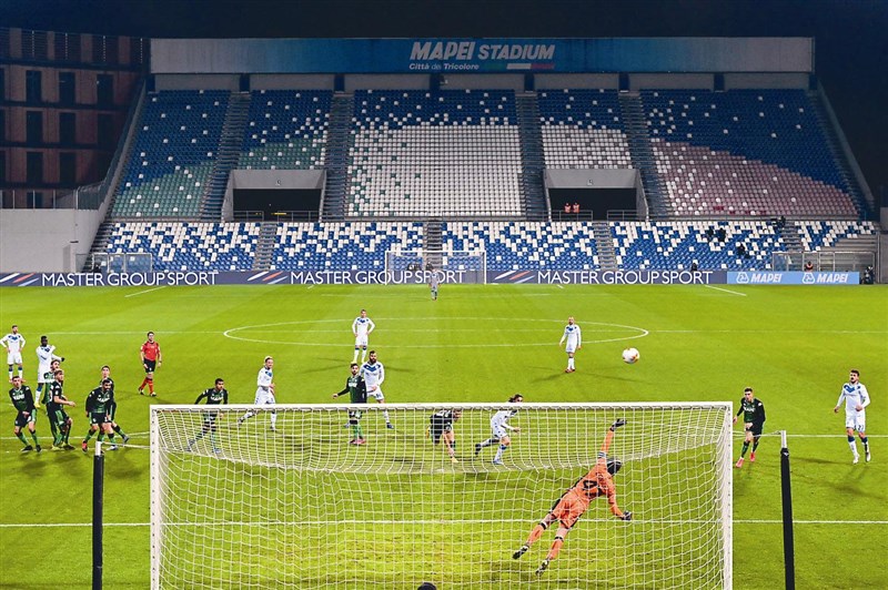 義大利十日起全面禁止體育賽事,義甲薩索羅隊(黑衣)與布雷西亞隊(白衣)九日比賽,成為停賽前最後一役。球賽閉門舉行,觀眾席空蕩蕩。圖/美聯社