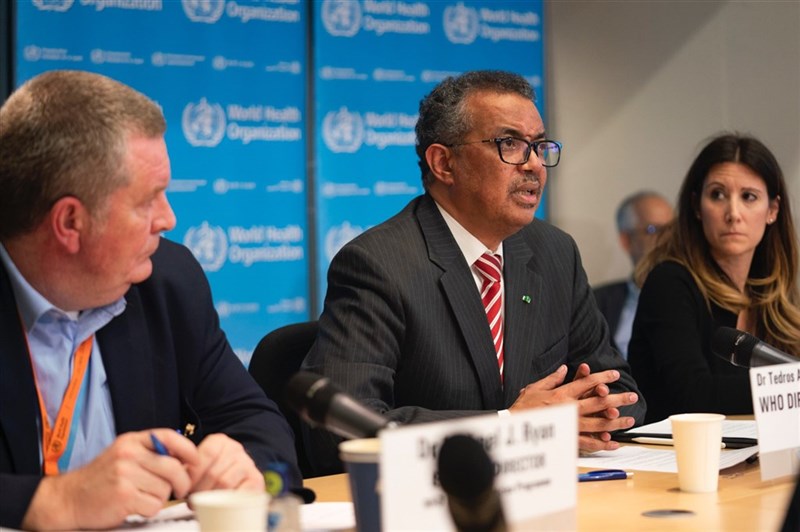 世界衛生組織秘書長譚德塞(中)11日宣布2019冠狀病毒疾病為全球「大流行」,預期疫情將進一步擴散。圖/取自twitter.com/WHO